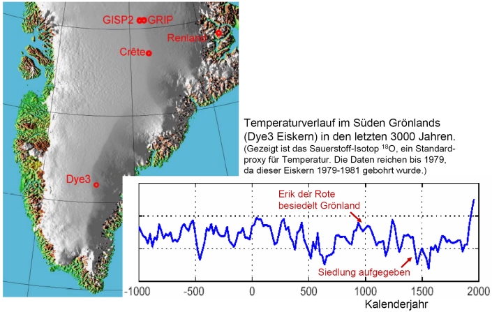 Der Dye3 Eisbohrkern liegt der Wikingersiedlung am nächsten (Abbildung). Er zeigt, dass im Süden Grönlands die Temperaturen Mitte des 20. Jahrhunderts (am Ende des Bohrkerns) wärmer waren als je in den vorherigen dreitausend Jahren.