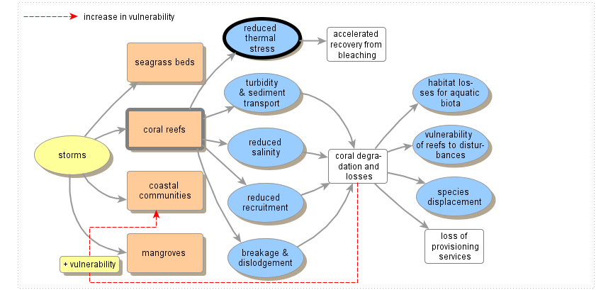 This is actually a positive impact. At broad spatial scales, tropical cyclones can induce cooling of the upper ocean (SST drops up to 6°C) which can persist for weeks and thus reduce thermal stress and accelerate the recovery of bleached corals due to sea-surface temperature (SST) warming). From an analysis of a global dataset (1985-2009) related to tropical cyclones (TC), significant correlations were found between TC activity and the severity of thermal stress at various spatial scales, particularly for Caribbean reefs. From this, it is apparent that TCs play a role in bleaching dynamics at a global scale. During years of high thermal stress and frequent TCs, thermal stress at reef areas was generally low when TC activity was high. However, the prevalence and distribution of this interaction varies by region and requires further examination at finer spatial and temporal scales using actual SST data