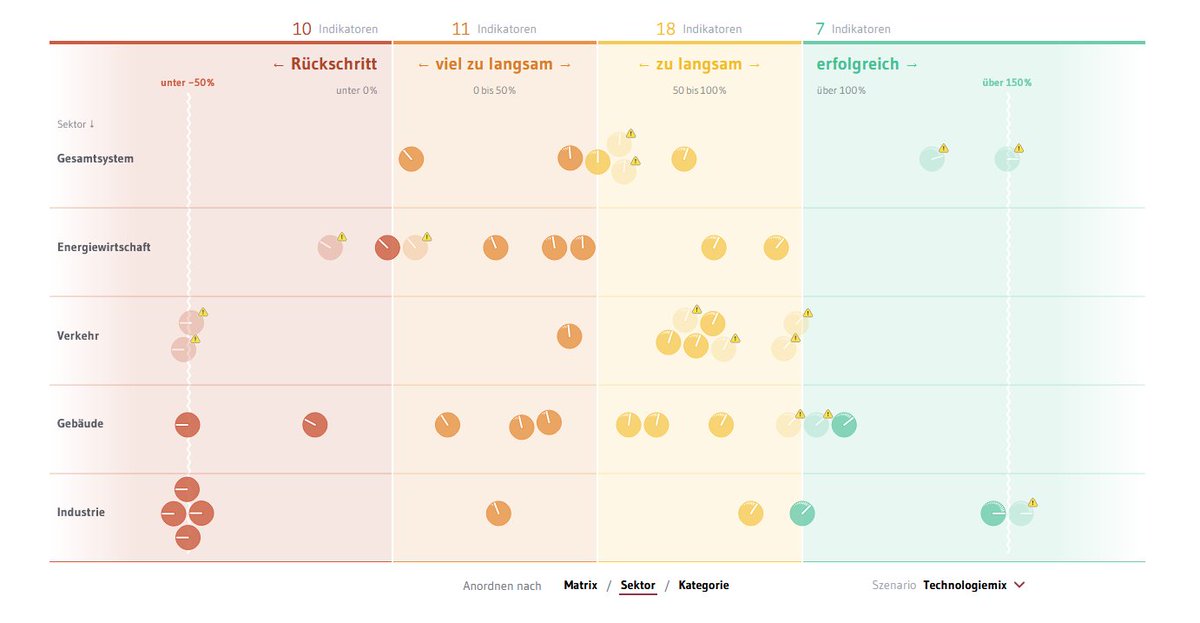 Auch bei den Erfolgen lohnt es sich, genauer hinzuschauen. Jüngste Ereignisse wie die Corona‐Pandemie oder die Energiekrise haben auf die Indikatoren einen starken Einfluss. Manch ein „Fortschritt“ auf dem Weg zur Klimaneutralität ist deshalb nicht der notwendigen strukturellen Transformation geschuldet, sondern geht lediglich auf kurzfristig wirkende Entwicklungen zurück. Diese im Tracker gekennzeichneten „Sondereffekte“ sollten deshalb mit Vorsicht interpretiert werden, so die Fachleute. Denn Emissionen, die etwa im Zuge der Pandemie durch das Herunterfahren der Industrieproduktion oder weniger Verkehr auf den Straßen gesunken sind steigen nach der Pandemie wieder an.