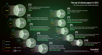 06.01.2023 - In einer Rangliste der in Nachrichten und sozialen Medien am häufigsten genannten Klima-Studien zählen bei nicht weniger als 3 der 10 Top-Studien Wissenschaftlerinnen und Wissenschaftler des Potsdam-Instituts für Klimafolgenforschung (PIK) zu den Autoren. Die Rangliste wird alljährlich vom renommierten Fach-Newsletter "Carbon Brief" veröffentlicht und basiert auf dem sogenannten Altmetric-Score der Arbeiten. Dieses Kennzahlsystem ist nicht perfekt, aber ein guter Indikator, um die öffentliche Wahrnehmung von klimawissenschaftlichen Publikationen zu beurteilen.