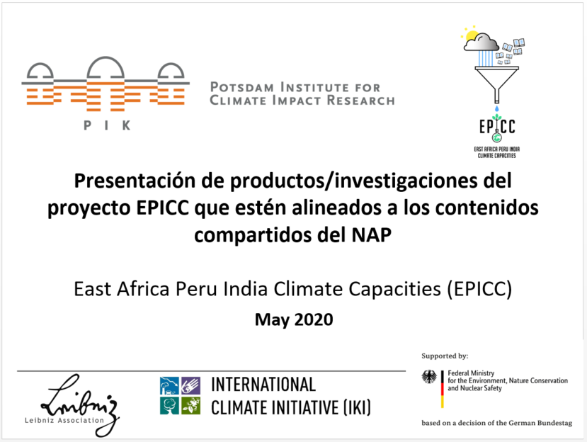 Following several meetings and discussions with MINAM and SENAMHI, the EPICC project has identified several entry points to contribute to the development and implementation of the NAP. Hydrology and Agriculture, two of the five thematic areas (besides Health, Forests and Fisheries) addressed within NAP, lie at the center of the project. Another focus areas of EPICC is Climate Migration, which received increasing attention in the NAP development. Thus, EPICC is ready to support the NAP in climate risk analysis and climate risk mapping as well as the translation of scientific results for policy making.