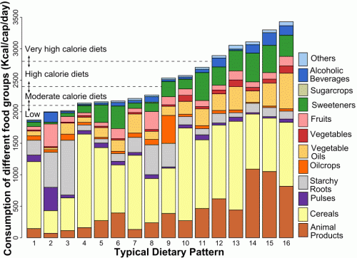 Food consumption patterns are changing globally in terms of both quantity and composition. These lifestyle-related changes will increase global food demand significantly, causing environmental stresses accounted for by the external inputs required for food production. Figure 1 shows the typical dietary patterns observed globally during the period of 1961-2007, and also projections up until 2050.