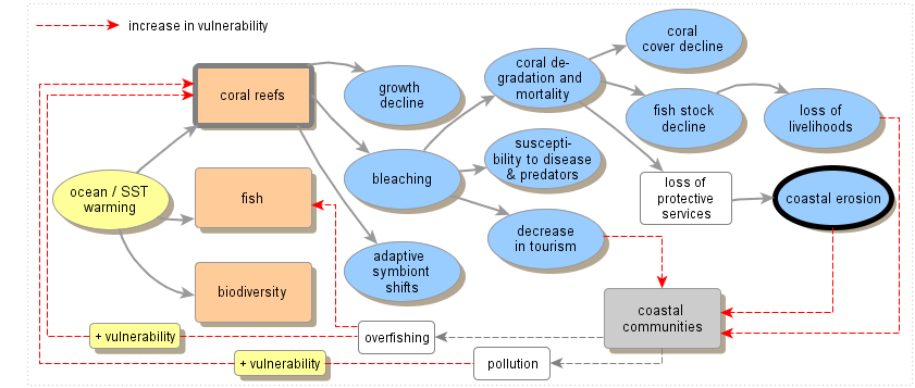 Many corals in this region bleached and subsequently died during the 1998 ENSO events due to the high water temperatures in combination with other meteorological and climatic factors. The secondary socioeconomic effects of coral bleaching for coastal communities of the Indian Ocean are likely to be long lasting and severe. In addition to potential decreases in fish stocks and negative effects on tourism, erosion may become an acute problem, particularly in the Maldives and Seychelles. Erosion will result from losses of the protective barrier function of the reefs.
