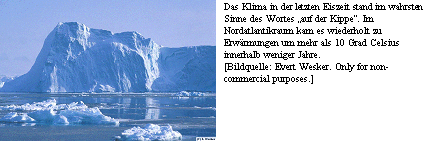 Während der letzten Eiszeit, die vor 120.000 Jahren begann, gab es mindestens zwanzig drastische Klimawechsel. Die nach ihren Entdeckern benannten Dansgaard-Oeschger-Ereignisse begannen mit einem plötzlichen Anstieg der regionalen Temperatur im Nordatlantikraum um bis zu 12 Grad Celsius innerhalb eines Jahrzehnts. Zeugen dieser wiederholten Klimakapriolen der Eiszeit sind vor allem grönländische Eisbohrkerne sowie Tiefseeablagerungen des Atlantiks. Aber auch in Tropfsteinen und anderen ,Klimaarchiven" wurden diese gewaltigen Schwankungen dokumentiert. Nach dem Übergang in die gegenwärtige Warmzeit vor rund 10.000 Jahren traten jedoch keine solchen abrupten Klimasprünge mehr auf.
