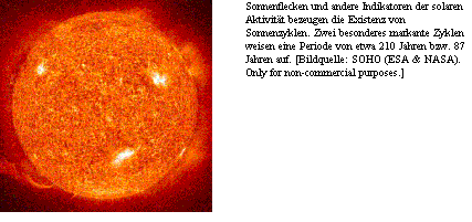 ,Seit der Entdeckung der Dansgaard-Oeschger-Ereignisse in den 1980er Jahren war es eine der großen Herausforderungen für Klimatologen, eine schlüssige Erklärung für diese abrupten Temperaturschwankungen während der Eiszeit zu finden", so Holger Braun, Doktorand der Heidelberger Akademie der Wissenschaften und Erstautor der Studie. Einen physikalischen Mechanismus hatten seine Potsdamer Kollegen bereits vor einigen Jahren vorgestellt (Nature, 11. Januar 2001): demnach kann eine Instabilität der eiszeitlichen Ozeanzirkulation die abrupten Klimawechsel erklären. Rätselhaft blieb jedoch die Regelmäßigkeit der Erwärmungen. Diese traten, mit einigen Lücken, meist alle 1470 Jahre auf (Geophysical Research Letters, 21. Mai 2003). Einige Wissenschaftler vermuteten bereits, daß Schwankungen der Sonne den 1470-Jahreszyklus ausgelöst haben könnten. Hinweise auf periodische Variationen der Sonne gab es durch Beobachtung von Sonnenflecken bereits seit über 150 Jahren. Die Daten zeigen insbesondere Sonnenzyklen mit Perioden von etwa 87 Jahren und 210 Jahren. Ein Zyklus von 1470 Jahren wurde bislang jedoch nicht gefunden. ,Die Bedeutung dieser Untersuchung liegt darin, daß sie uns zeigt, wie komplex die Reaktionen des Systems Erde sind", so Prof. Dr. Kurt Roth, Direktor des Instituts für Umweltphysik der Universität Heidelberg. ,Während bestimmter Zeiten, hier der Eiszeit, reagiert es extrem empfindlich auf Einflüsse von außen. Die Zeitskala der Reaktion entspricht nicht der Zeitskala des Auslösers. Dies ist eine wesentliche Erkenntnis, die auch Eingang in das aktuelle Verständnis unseres Klimasystems finden wird."