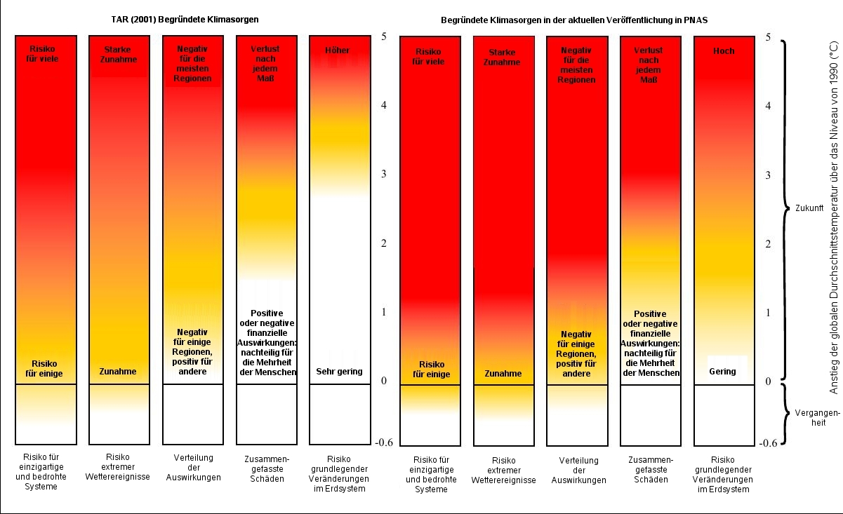 Artikel: Joel B. Smith, Stephen H. Schneider, Michael Oppenheimer, Gary W. Yohe, William Hare, Michael D. Mastrandrea, Anand Patwardhan, Ian Burton, Jan Corfee-Morlot, Chris H. D. Magadza, Hans-Martin Füssel, A. Barrie Pittock, Atiq Rahman, Avelino Suarez, and Jean-Pascal van Ypersele: Assessing dangerous climate change through an update of the Intergovernmental Panel on Climate Change (IPCC) "reasons for concern". Proceedings of the National Academy of Sciences