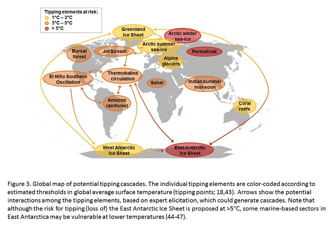 „Diese Kippelemente könnten sich wie eine Reihe von Dominosteinen verhalten. Wird einer von ihnen gekippt, schiebt dieses Element die Erde auf einen weiteren Kipppunkt zu. Es könnte sehr schwierig oder sogar unmöglich sein, die ganze Reihe von Dominosteinen davon abzuhalten, umzukippen. Manche Orte auf der Erde könnten unbewohnbar werden, wenn die „Heißzeit“ Realität würde“, ergänzt Johan Rockström, Direktor des Stockholm Resilience Centre und designierter Ko-Direktor des Potsdam-Instituts für Klimafolgenforschung.