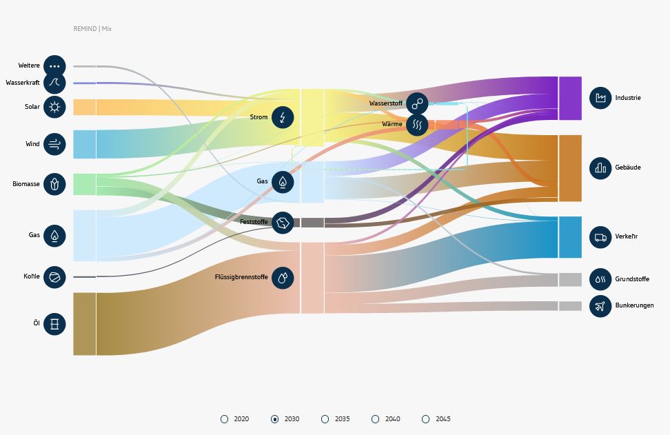 Die im Pathfinder dargestellten Transformationspfade geben anschaulich Antworten auf die zentrale Frage, welche Rolle die direkte Elektrifizierung durch erneuerbaren Strom oder die indirekte Elektrifizierung durch strombasierte E-Fuels und Wasserstoff spielen können. Die Transformationspfade beschreiben verschiedene Technologiestrategien, in denen die hochaktuelle Frage der Gewichtung der nachhaltigen Energieträger Strom, Wasserstoff und E-Fuels im Endenergiemix diskutiert wird. Der Pathfinder führt Nutzer durch die Gemeinsamkeiten bzw. Unterschiede der Transformationspfade und zeigt, wo eine direkte Elektrifizierung durch Strom eine besonders robuste Strategie sein kann (zum Beispiel im Personenverkehr) oder im Umkehrschluss, wo die energieintensiven Energieträger, Wasserstoff und E-Fuels in Zukunft eine wichtige Rolle spielen können (zum Beispiel bei der Stahlproduktion oder im Flugverkehr). Der Nutzer kann mit wenigen Handgriffen entdecken, wie sich die verschiedenen Technologiestrategien zueinander verhalten. Ein besonderes Augenmerk wurde dabei auf die Energiebedarfe der Pfade gelegt, für die besonders Wasserstoff und E-Fuels hoch relevant sind.