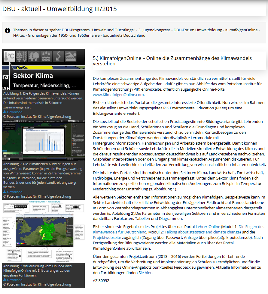 DBU - Presseinformation, „Entwicklung und Erprobung einer online-basierten Umweltbildung am PIK“ (PDF-Datei)