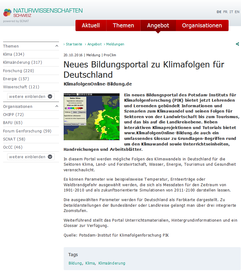 Naturwissenschaften Schweiz, Vorstellung von KlimafolgenOnline (PDF-Datei)