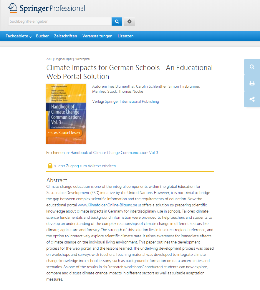 Ines Blumenthal, Carolin Schlenther, Simon Hirsbrunner, Manfred Stock, Thomas Nocke: Climate Impacts for German Schools—An Educational Web Portal Solution. Handbook of Climate Change Communication: Vol. 3, pp 209-223, Springer International Publishing, https://doi.org/10.1007/978-3-319-70479-1_13, 2018. (PNG-Datei)