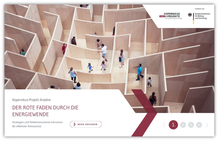 Durch den Faden der Ariadne gelang dem Helden Theseus in der griechischen Mythologie die sichere Navigation durch das Labyrinth des Minotaurus. Dies ist die Leitidee für das Energiewende-Projekt Ariadne im Konsortium von mehr als 25 Institutionen. Ariadne führt durch einem gemeinsamen Lernprozess mit Politik, Wirtschaft und Gesellschaft, um Überblick und Orientierung bereitzustellen für die Gestaltung der Energiewende.
