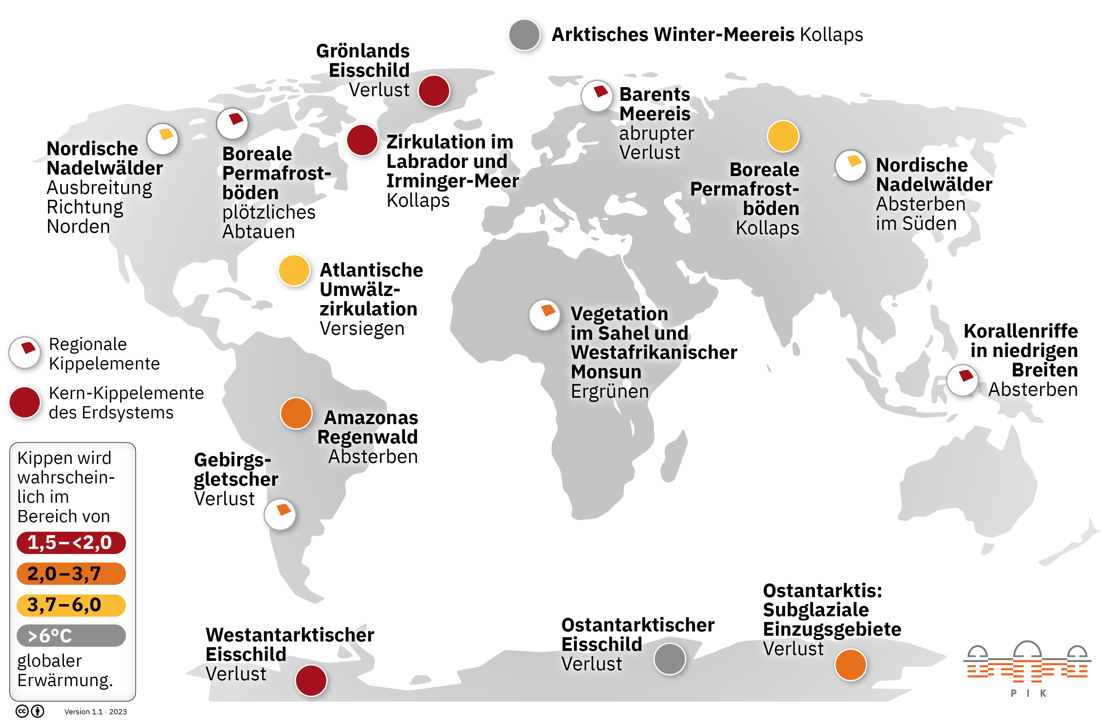 Räumliche Verteilung der globalen und regionalen Kippelemente. Die Farben bezeichnen den Temperaturbereich, in dem ein Kippen wahrscheinlich wird. Abbildung designed am PIK (unter CC-BY Lizenz), wissenschaftliche Grundlage ist Armstrong McKay et al., Science (2022).