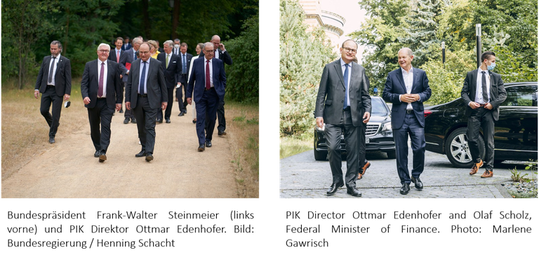 Des weiteren empfängt das PIK regelmäßig hochrangige Entscheidungstragende und berät sie in Fragen der Klimapolitik - darunter der deutsche Staatspräsident Steinmeier mit den Staatsoberhäuptern aller deutschsprachigen Länder, der damalige Finanzminister (und heutige Bundeskanzler) Scholz und Experten und Expertinnen der Deutschen Bundesbank.