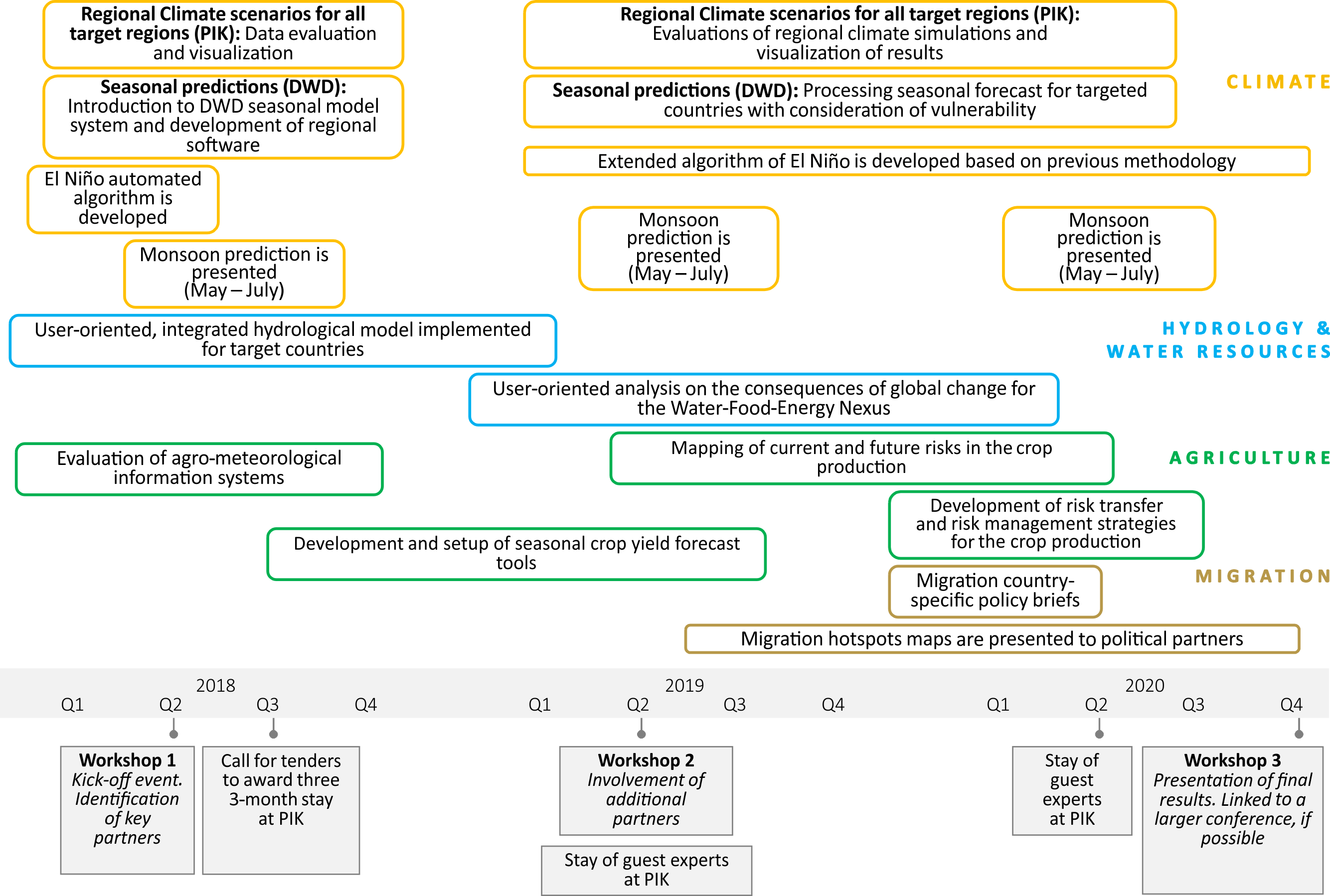 Predictions on Monsoon, El Niño and long-term climate scenarios developed in the Climate module will significantly feed further modeling and assessments on Hydrology and Water resources and Agriculture. On the other hand, strategic outcomes from the Migration module, i.e. policy briefs per country, will be completed in 2020. Finally, workshops, study stays and guest expert visits will permanently developed within the Module of Capacities Building and Knowledge Transfer. Simultaneously, this module will foster the synthesis and integration of available climate data from PIK and related projects (2018); provide a quantitative analysis of the "climate-services-chain" (2019) and lastly, it will test the products with users and record their feedback for improvement purposes (2020).