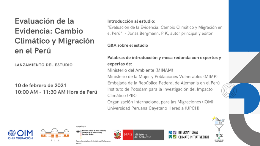 The launch of the report in February 2021 attracted 185 registrations from 15 countries. Participants came from diverse public and non-state organizations, including civil society, as well as donors. The importance of the report for current policy developments in Peru and beyond was emphasized in introductory remarks by Kira Vinke, EPICC project lead at PIK; Stefan Herzberg, the German Ambassador in Peru; Luisa Elena Guinand Quintero, Vice Minister of Strategic Development of Natural Resources, Peruvian Ministry of the Environment (MINAM); Johan Rockström, Director of PIK; and Jorge Baca, Head of Mission IOM Peru. Jonas Bergmann, EPICC researcher and lead author of the report, presented main findings and answered questions from the audience. A high-level panel discussion followed on progress and research needs on climate migration in Peru to support the National Adaptation Plan (NAP) and the Plan of Action to Prevent and Address Forced Migration Caused by the Effects of Climate Change. The roundtable counted with the expertise of Silvia Cristina Rodríguez Valladares, Director of Adaptation to Climate Change and Desertification at MINAM; Sylvia Cáceres Pizarro, General Director of Population, Development and Volunteering at the Peruvian Ministry of Women and Vulnerable Populations (MIMP); Carol Zavaleta, researcher at the Intercultural Citizenship and Indigenous Health Unit of the Universidad Peruana Cayetano Heredia (UPCH); Andrea Milan, Data Coordinator at IOM, and Jonas Bergmann. It was moderated by Pablo Escribano, IOM’s Regional Thematic Specialist on Migration, Environment and Climate Change in Latin America and the Caribbean.