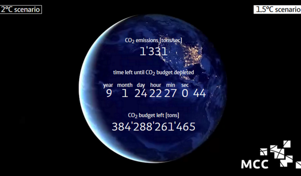 The Mercator Research Institute on Global Commons and Climate Change (MCC) has updated its Carbon Clock in response to the latest IPCC Special Report, which warns that global warming must be limited to a 1.5⁰C increase in order to avoid dangerous climate change. Based on the report, this can only be achieved by limiting the total amount of CO2 to be released into the atmosphere to a maximum of 420 gigatons (Gt). However, since the world emits around 42 Gt of CO2 every year—the equivalent to 1332 tonnes per second—that budget is expected to be used up in about nine years. The budget for staying below the 2⁰C threshold, for its part, of approximately 1070 Gt, will be exhausted in about 26 years.