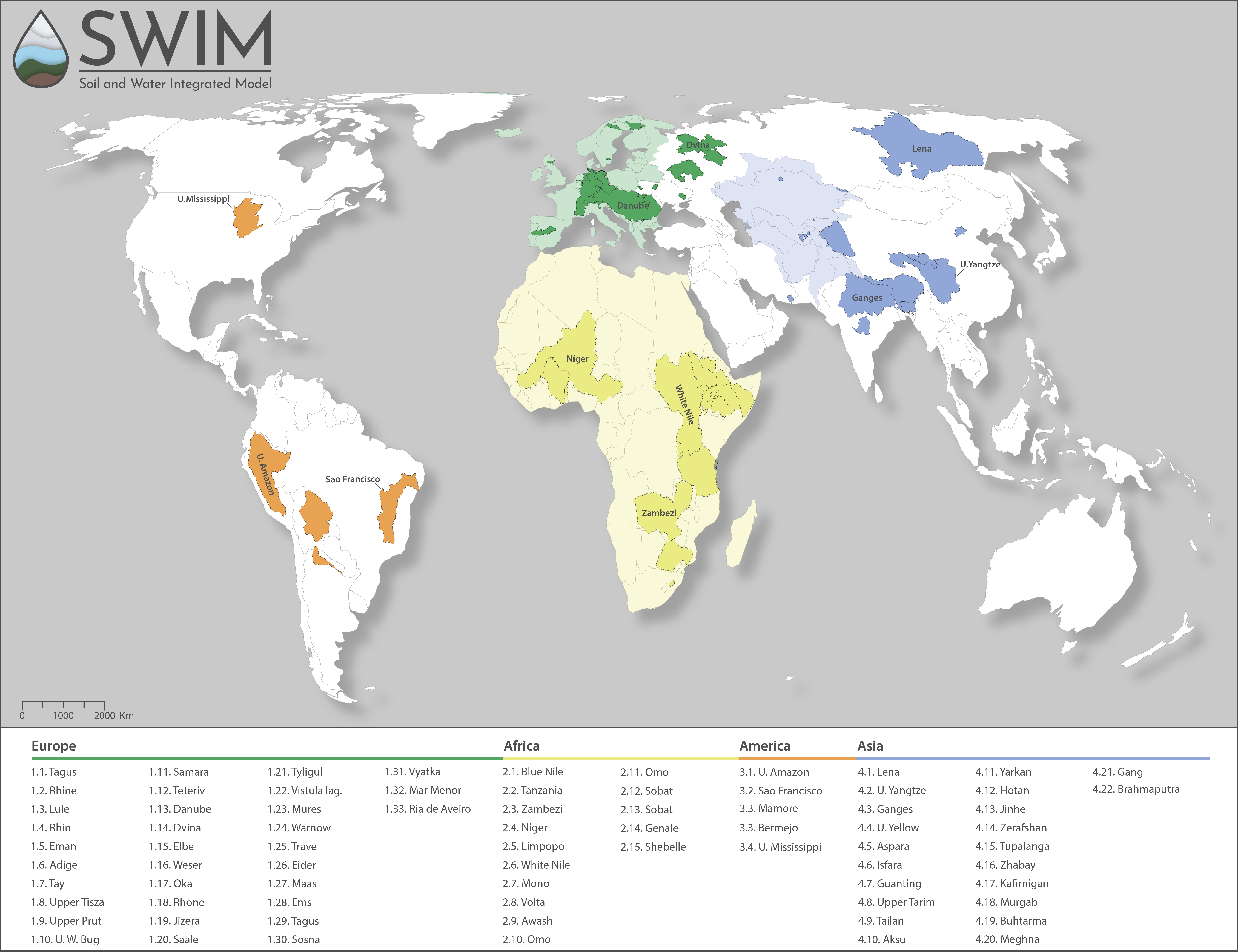 SWIM was specifically developed to investigate climate and land use change impacts at the regional scale, where the impacts are manifested and adaptation measures take place. The model simulates interlinked processes at the mesoscale such as runoff generation, plant and crop growth, nutrient and carbon cycling, and erosion. It provides numerous model outputs such as river discharge, crop yield, and nutrient concentrations and loads. The approach allows simulation of all interrelated processes within a single model framework at a daily time step using regionally available data (climate, land use and soil) and considering feedbacks. The model setup and postprocessing are supported by a GIS interface (based on GRASS).