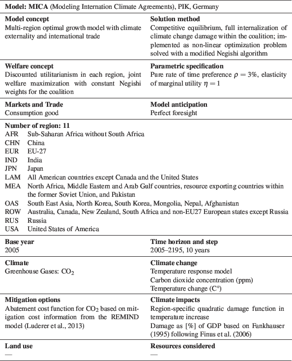 MICA can be solved for non-cooperative behavior of the regions (Nash Equilibrium), full cooperation (global social optimum), and any coalition of regions cooperating in climate policy (Partial Agreement Nash Equilibrium).