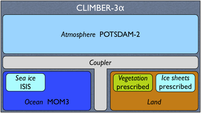 CLIMBER-3α has evolved from the highly successful CLIMBER-2 model. The main difference with respect to CLIMBER-2 is the ocean component, which has been replaced by a state-of-the art ocean model including an ocean general circulation model (OGCM), a biogeochemistry module and a state-of-the-art sea-ice model. The atmospheric resolution was slightly increased as compared to CLIMBER-2. Thus, CLIMBER-3α includes modules describing the atmosphere, land-surface scheme, ocean, sea-ice, and marine biogeochemistry.