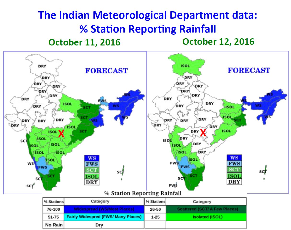 These observations were confirmed by the data from the Indian Meteorological Department (see IMD maps): October 11-th - from 1 to 25 percent of meteorological stations in the area 75000 km2 around the region of our forecast reported only isolated rain; October 12-th -100 percent of meteorological stations reported 'No rain' in the region of our forecast, and also in all surrounding regions as well as in regions located across the subcontinent in the direction from the North Pakistan to the Bay of Bengal.