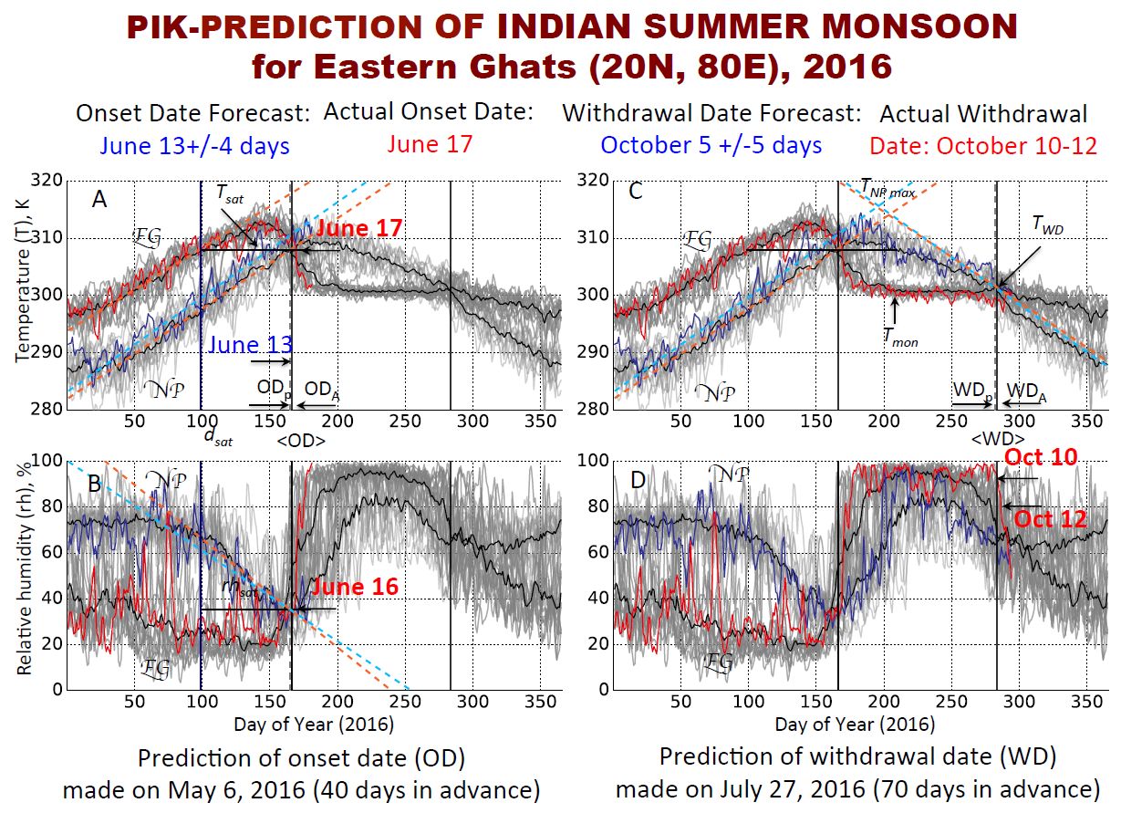 After monsoonal withdrawal, the predictions can be compared with the observed withdrawal. “The Southwest monsoon has been withdrawing from the region of our forecast (the Eastern Ghats, grid point 20N, 80E) during several days. On October 10th, the relative humidity started to decrease, following the monsoon condition in the previous week (95 percent level). On October 11th-12th, the relative humidity passed below the 80 percent threshold, and a transition back to a monsoon state is nearly impossible (see PIK-Prediction Figure). Hence, the date of the start of monsoon withdrawal, October 10th, coincided within uncertainties with our forecast.” - said Elena Surovyatkina