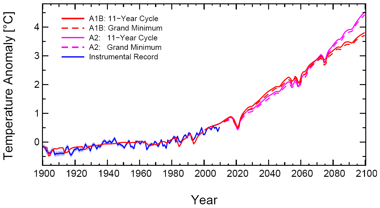 They performed three simulation experiments with different solar forcing: one without a Grand Minimum, repeating the last 11-year solar activity cycle until 2100, and two with the Sun entering a new Grand Minimum lasting till the end of the century. In these minima, solar irradiance is reduced by 0.08 and 0.25 percent of its value in 1950, the former value corresponding to the reconstructed reduction of solar irradiance during the Maunder Minimum.