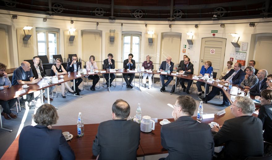 Chancellor Angela Merkel discussing climate risks and policy solutions with experts from natural sciences and social sciences. Photo: Guido Bergmann/BPA