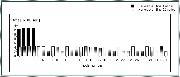 In the case of a small number of nodes this approach ensures a balanced distribution of user elapsed time, but for a higher number of nodes the load of the processors becomes more imbalanced. Figure 2, "Distribution of user elapsed time for initial data input processing" shows the distribution of user elapsed time for 4 processor nodes and for 32 processor nodes in the case of the input of the GRIB code initial data (including 120 GRIB data arrays).