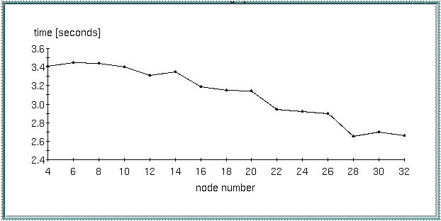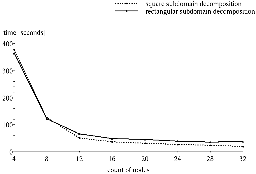 The time measurement was realized by using subroutines of the Fortran 90 library, namely rtc -- a subroutine for wall clock time (also real time) -- and etime -- a subroutine for user elapsed time (also CPU time). The implementation of the communication subsystem library used was the User Space (US) communication subsystem (the hardware is configured with its high-performance switch feature).