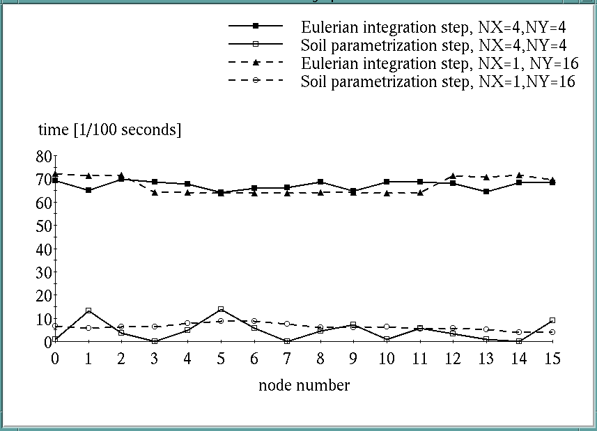Because soil parametrization is less time consuming it follows that in the case of rectangular decomposition increasing time of Eulerian integration and the decreasing time of soil parametrization cancel each other out.
