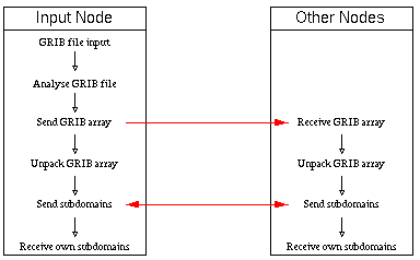 Our model input files are given as binary packed records in the GRIB (gridded binary) format. That means that a processor cannot get its data from disk space in a direct way. At first it is necessary to analyse the structure of the GRIB file and later to decode this GRIB file to build up input arrays. Therefore, only a single node (input node, generally node zero) reads the whole GRIB file to its local memory. This node analyses the GRIB structure and sends single, but complete, GRIB fields to the other nodes which then are able to unpack the fields. After decoding every node distributes the data to all other nodes according to their subdomains. Then it returns a message to the input node that it is ready for receiving new unpacked arrays. If such a message is not present for the input node it also starts decoding GRIB fields and distributing them to the subdomains. But for the input node the distribution of GRIB data to the other nodes has a higher priority. After decoding of the whole GRIB file every node has completed its own input. The tasks of the input node and the other nodes are represented in Figure 1, "Tasks of input node and other nodes".