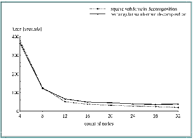 Figure 7 and Figure 6 show the scalability of a full prediction step of REMO in the case of square decomposition and in the case of rectangular decomposition by use of up to 32 processors. The measured prediction step contains the Eulerian integration scheme, semi-implicit corrections, soil parametrization, radiation and convection. It is not representative for all prediction steps, because, e.g. the radiation is computed only every eighteenth time step.