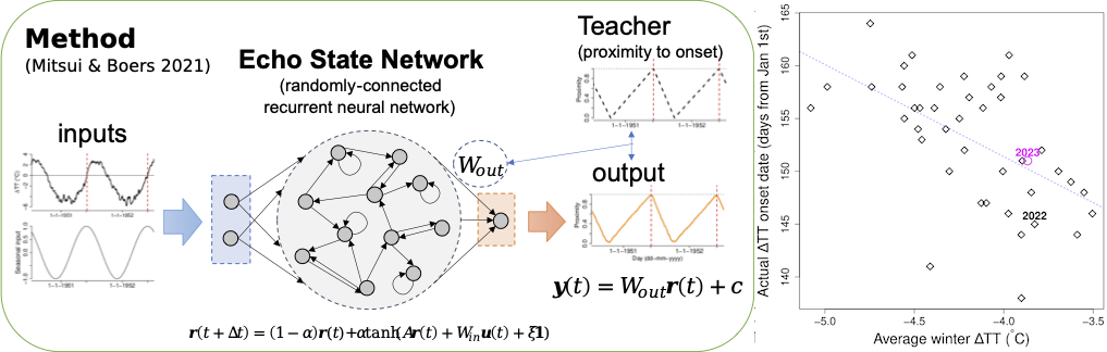 Fig. 2. (Left) Schematic of our method. We construct recurrent neural networks that approximate proximity to the onset of Indian Summer Monsoon (Mitsui and Boers, 2021). (Right) Empirical negative correlation between the average winter ∆TT (the first 70 days of year) and the actual onset date (R=-0.54). The point for 2023 alone is based on the predicted onset date.