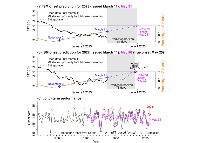 Figure A: (a) Prediction of the Indian Summer Monsoon onset date for 2023 (May 31st (median), with an interquartile range from May 29th to June 1st). The actual onset is June 9th. (b) The same but for 2022. (c) Long-term prediction performance since 1981.