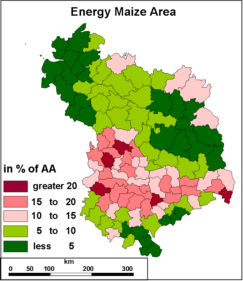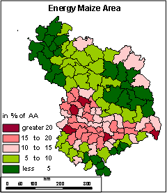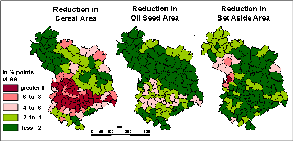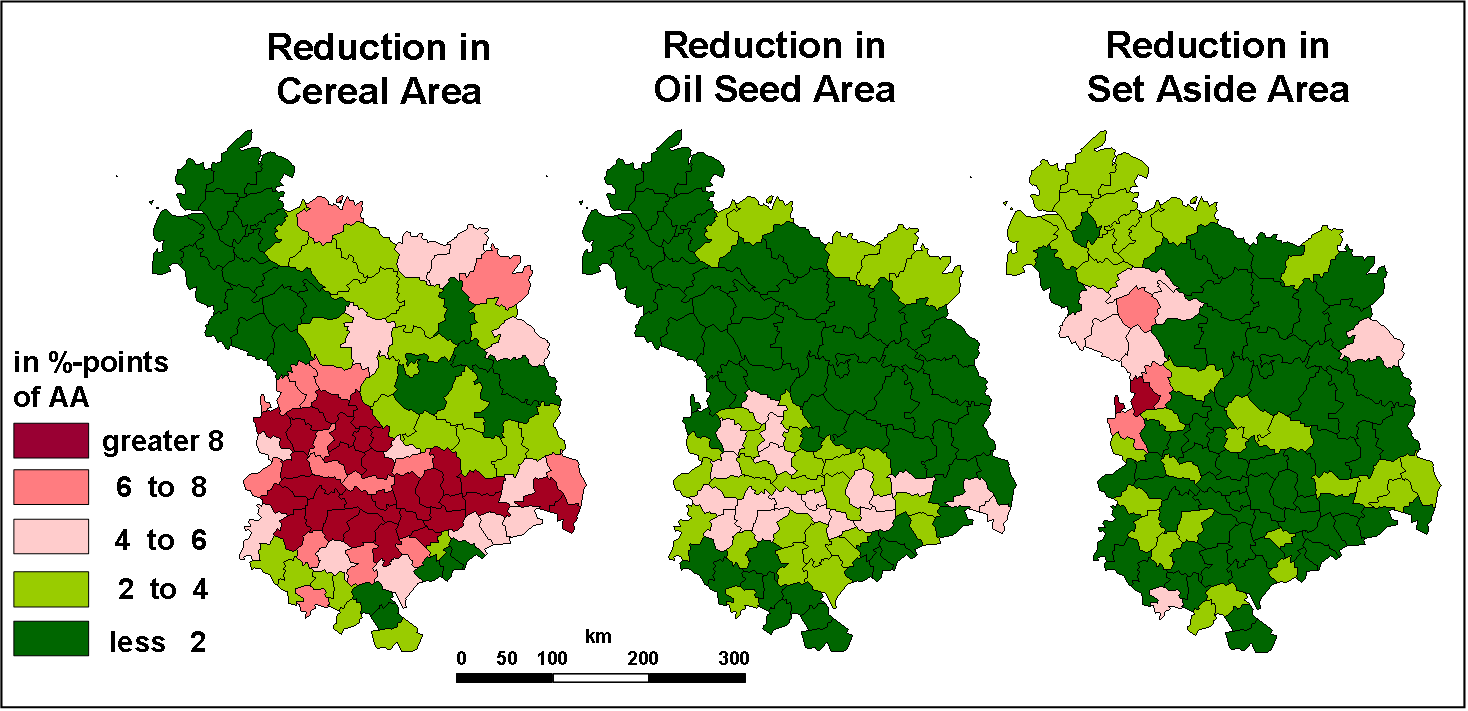The graphs show agricultural land use changes as a consequence of the Renewable Energy Act of 2004 that introduced a strong support for cropping renewable resources for power production. The shares of cereal, oilseed and set aside area of total agricultural area (AA) decrease due to an expansion of renewable resources “energy maize”.