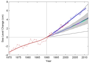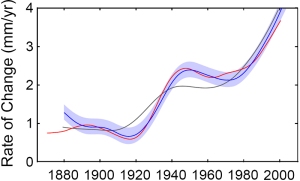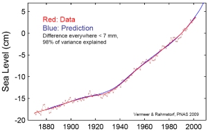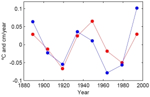 level rise (red, cm/year), both detrended. From Rahmstorf