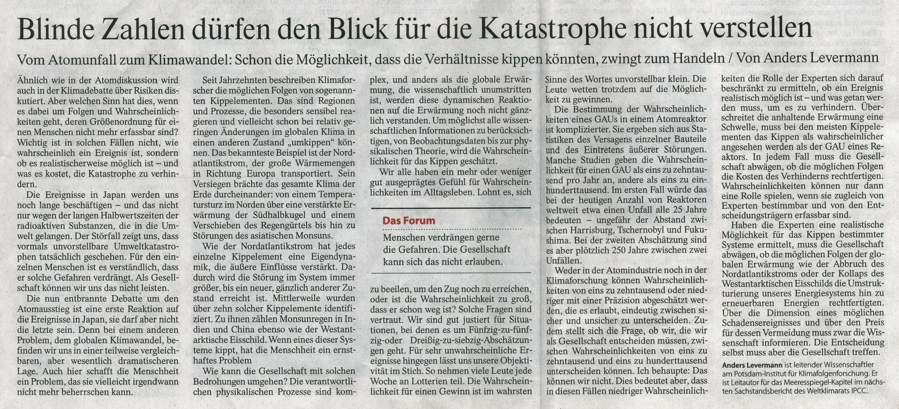 » October '23 Book review: Folding the World » October '23 Book review: Folding the World » October '23 Book review: Folding the World » October '23 40-min Podcast: Folding the World » October '23 Interview: Can the world be saved? » September '23 Republica Hamburg 2023: Folding the World » August '23 Record heat in the world ocean » August '23 World ocean warmer than ever » July '23 Mosse Lecture: Folding the World » July '23 "Come On!" » July '23 Climate scientists see economy threatened » July '23 "What's happening in the North Atlantic is worriesome" » July '23 Handelsblatt Podcast on tipping points » June '23 Republica 2023: Folding the World » June '23 Pressure in the system: record warming of global ocean » May '23 El Nino causes trillions in lost economic growth » May '23 Economic loss from El Nino » May '23 Oceanic heat can cause weather extremes » May '23 Oceanic heat record » April '23 taz lab 2023: Folding the World » March '23 Dresdner speech at theater on Folding the World » March '23 Interview on climate change and abstinence » February '23 Interview on climate change and Folding » January '23 The future of Thwaites glacier in Antarctica » November '22 2-h interview: The Folding of the World » November '22 Quand la température monte, la haine en ligne aussi » November '22 Global toll of extreme heat is trillions of dollars » October '22 Economic losses from weather extremes » October '22 Hotter days bring out hotter tempers » October '22 The Monsoon Is Becoming More Extreme » September '22 Global warming and aggressive behaviour » September '22 Hate speech on social networks increases with heat » September '22 Extreme Temperatures Linked to Rise in Hate Tweets » September '22 Pakistan flood: climate change increases variability » September '22 Climate Change Is Making People Angrier Online » September '22 Hatespeech online: heat makes tweets more aggressive » September '22 Online hate speech increases during extreme weather » September '22 Hateful tweets multiply in extreme temperatures » September '22 When temperatures rise, hate increases » August '22 La Nina, extreme weather and climate change » August '22 US climate deal tries to induce structural change » June '22 How does Bangladesh cope with extreme flood? » June '22 Floods in Bangladesh conjure climate warnings » June '22 Rain-triggered floods in Bangladesh » February '22 Extreme rainfall can hamper global economy » February '22 More rainy days could dampen economic growth » February '22 More wet days will hamper global economy » February '22 India will lose from global warming » January '22 Rain in Spain causes financial pain » January '22 Change in daily rainfall hurts economy » January '22 Nature cover story on economic impact of rainy days » January '22 Live radio: Antarctic break-up » November '21 Prime-time TV Interview on climate conference COP26 » October '21 RippleResonance: climate change more expensive » October '21 RippleResonance: climate crisis threatens world economy » October '21 America's dirty divide: Sea level rise and famous sites » October '21 Our underwater future: Sea level rise around the world » October '21 Sea Level will hugely differ if we can limit warming » October '21 The ultimate rise of the oceans » October '21 World Under Water » September '21 Sea level rise threatens Venice » August '21 "Race against time" - adaptation to climate change » August '21 Cover article on climate tipping points » August '21 Prime-time TV Interview on IPCC report » June '21 Indian monsoon more intense & chaotic under warming » June '21 Climate change is remaking South Asian monsoon » June '21 "Earth will get as warm as we make it." » June '21 Domino effect of tipping points » June '21 Warming likely to make Indian monsoon dangerous » June '21 Million years of data confirms: monsoon to get worse » April '21 Monsoon: Serious consequences for a billion people » April '21 Chaotic monsoon threatens India's farmers » April '21 Climate change makes monsoon stronger, more erratic » April '21 Contagious solar cells: Satellite data & AI on Fresno » April '21 Climate change changes Indian monsoon » April '21 Indian monsoon gets more rainy with warming » April '21 Indian monsoon more volatile » April '21 'Chaotic' monsoons threaten India's farmers » April '21 Chaotic monsoon » April '21 Indian monsoon more chaotic » April '21 Antarctic tipping points » February '21 Climate change has high cost » January '21 Portrait: Anders Levermann » November '20 Is the 1.5 degree target feasible? » November '20 Interview on limit of adaptation, Fridays and Green Party » November '20 Invited speech at Green Party Convention » October '20 Antarctic ice loss » October '20 Podcast interview on Antarctica & warming » September '20 Rising temperature could melt Antarctica » September '20 Antarctic ice loss is irreversible » September '20 Even Paris Agreement threatens New York » September '20 Humanity is giving up New York » September '20 Nature cover story on hysteresis of Antarctic ice sheet » August '20 Warming intensifies river floods in China » August '20 Interview: "Why not less, but zero emissions?" » August '20 European heat wave and drought » July '20 "Antarctica is by far the biggest risk" » July '20 Interview in Russian on Siberian heat wave » July '20 The next five years of climate change » July '20 WMO 5-year climate prediction » July '20 Siberian heatwave puzzles climate scientists » July '20 Live radio: Heatwave in Sibiria » June '20 Collapse of Arctic system?