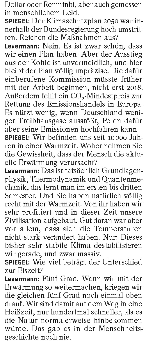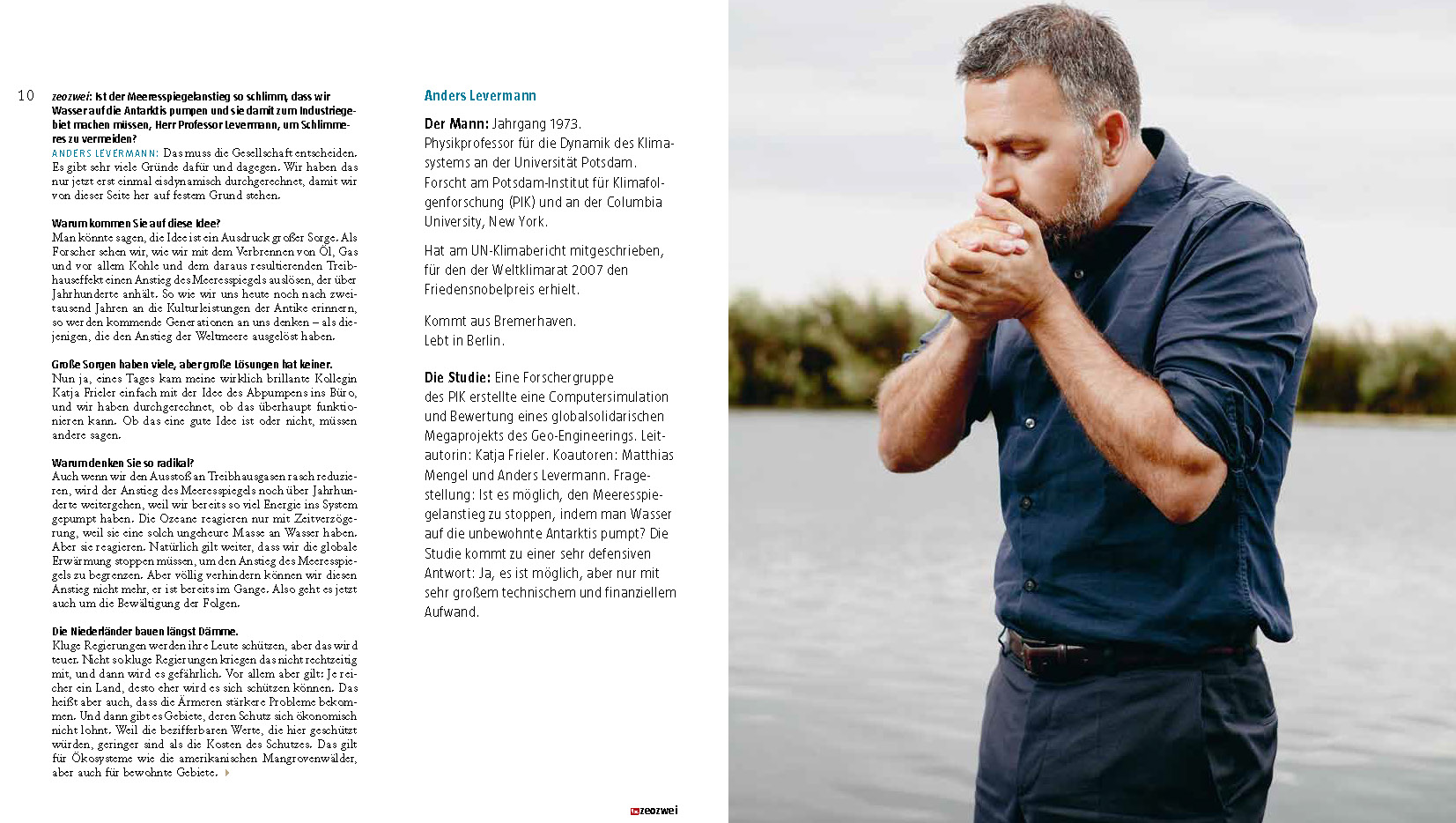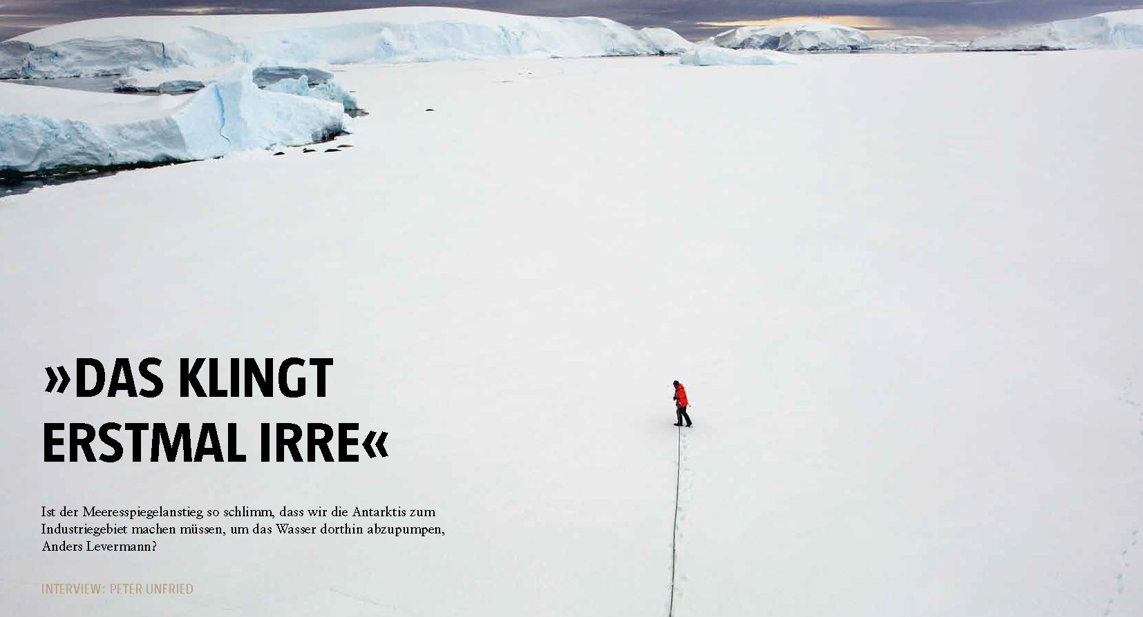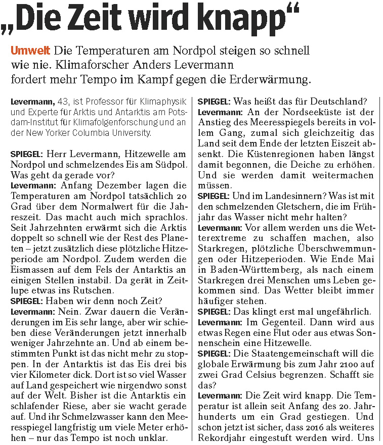 » April '21 Antarctic tipping points » February '21 Climate change has high cost » January '21 Portrait: Anders Levermann » November '20 Is the 1.5 degree target feasible? » November '20 Interview on limit of adaptation, Fridays and Green Party » November '20 Invited speech at Green Party Convention » October '20 Antarctic ice loss » October '20 Podcast interview on Antarctica & warming » September '20 Rising temperature could melt Antarctica » September '20 Antarctic ice loss is irreversible » September '20 Even Paris Agreement threatens New York » September '20 Humanity is giving up New York » September '20 Nature cover story on hysteresis of Antarctic ice sheet » August '20 Warming intensifies river floods in China » August '20 Interview: "Why not less, but zero emissions?" » August '20 European heat wave and drought » July '20 "Antarctica is by far the biggest risk" » July '20 Interview in Russian on Siberian heat wave » July '20 The next five years of climate change » July '20 WMO 5-year climate prediction » July '20 Siberian heatwave puzzles climate scientists » July '20 Live radio: Heatwave in Sibiria » June '20 Collapse of Arctic system?