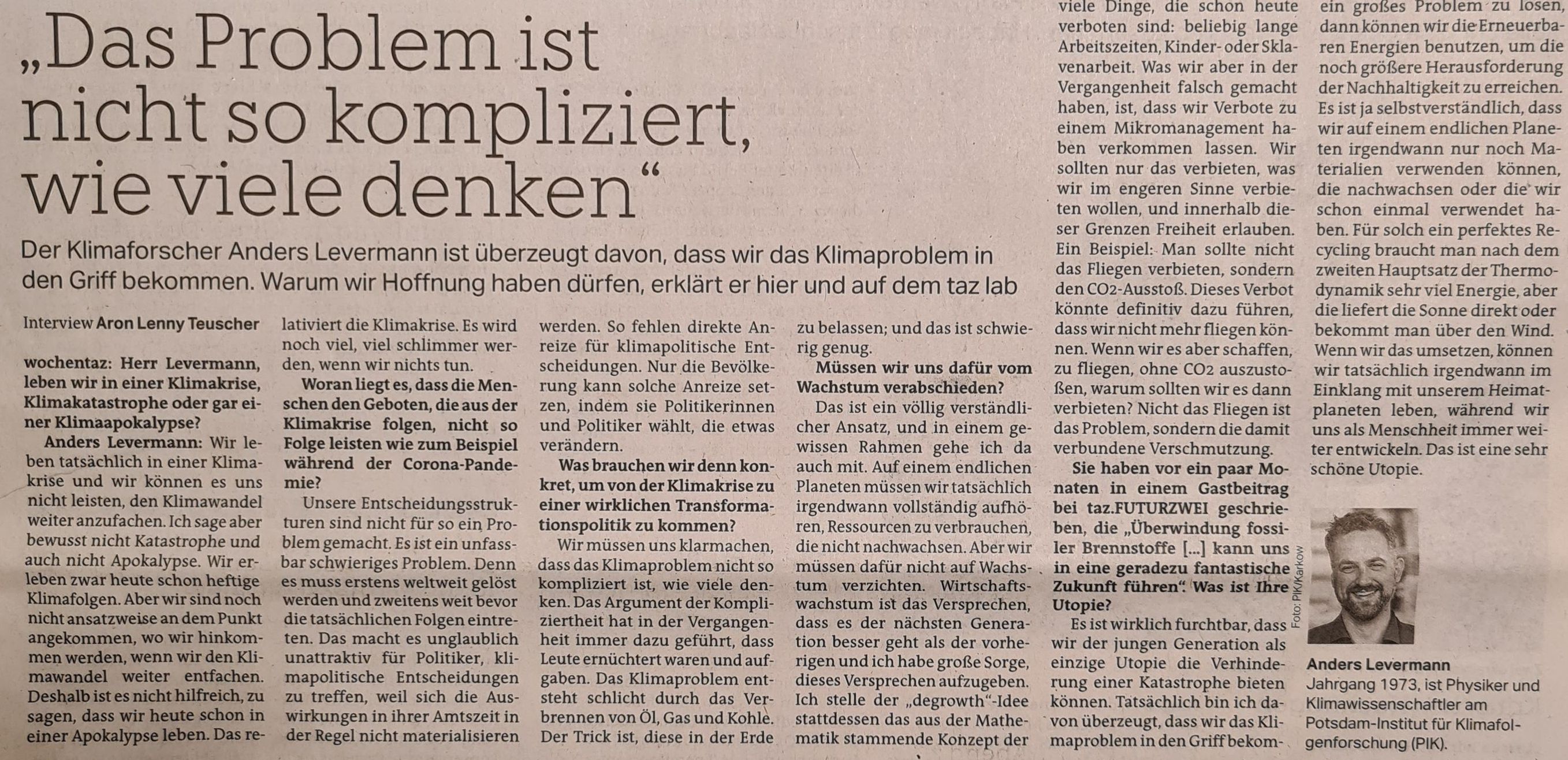 » April '21 Indian monsoon gets more rainy with warming » April '21 Indian monsoon more volatile » April '21 'Chaotic' monsoons threaten India's farmers » April '21 Chaotic monsoon » April '21 Indian monsoon more chaotic » April '21 Antarctic tipping points » February '21 Climate change has high cost » January '21 Portrait: Anders Levermann » November '20 Is the 1.5 degree target feasible? » November '20 Interview on limit of adaptation, Fridays and Green Party » November '20 Invited speech at Green Party Convention » October '20 Antarctic ice loss » October '20 Podcast interview on Antarctica & warming » September '20 Rising temperature could melt Antarctica » September '20 Antarctic ice loss is irreversible » September '20 Even Paris Agreement threatens New York » September '20 Humanity is giving up New York » September '20 Nature cover story on hysteresis of Antarctic ice sheet » August '20 Warming intensifies river floods in China » August '20 Interview: "Why not less, but zero emissions?" » August '20 European heat wave and drought » July '20 "Antarctica is by far the biggest risk" » July '20 Interview in Russian on Siberian heat wave » July '20 The next five years of climate change » July '20 WMO 5-year climate prediction » July '20 Siberian heatwave puzzles climate scientists » July '20 Live radio: Heatwave in Sibiria » June '20 Collapse of Arctic system?
