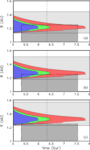 shown as dark gray areas) as constraint by the stellar age and the orbital