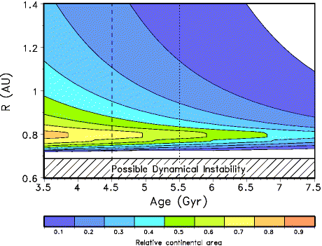and dotted line, respectively. The orbital stability limit lies between 0.69 AU and