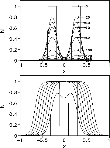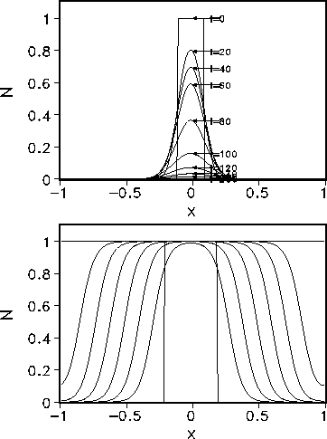 Figure 6: Evolution in time of the vegetation N(x,t) for a rectangular perturbation
