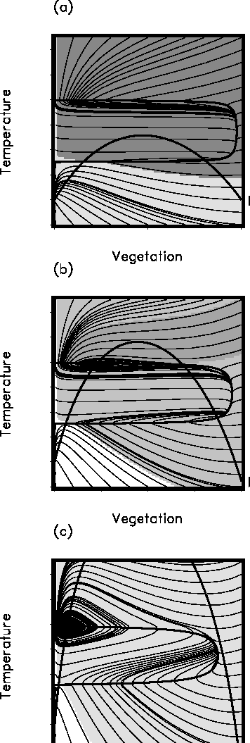 . (a): ``cold desert'' and ``cold'' planet are stable equilibria, (b) ``cold desert'' ``cold'' and ``hot'' planet are stable, (c) ``cold desert'' and ``hot'' planet are stable. Curve I: