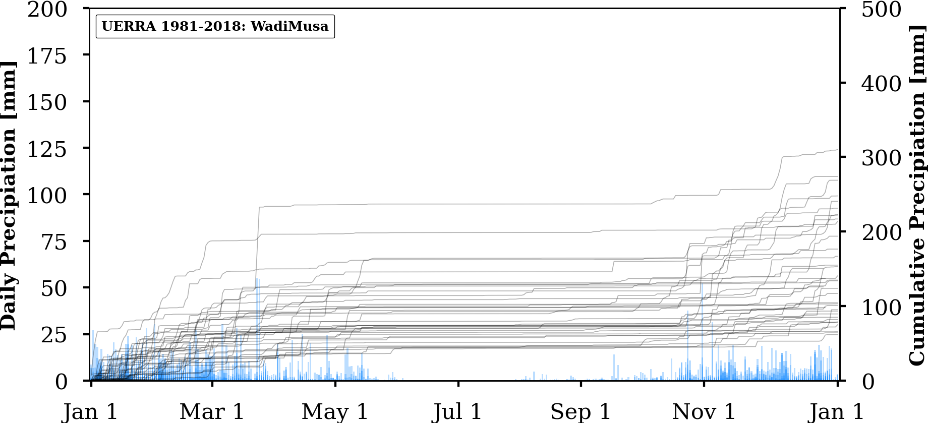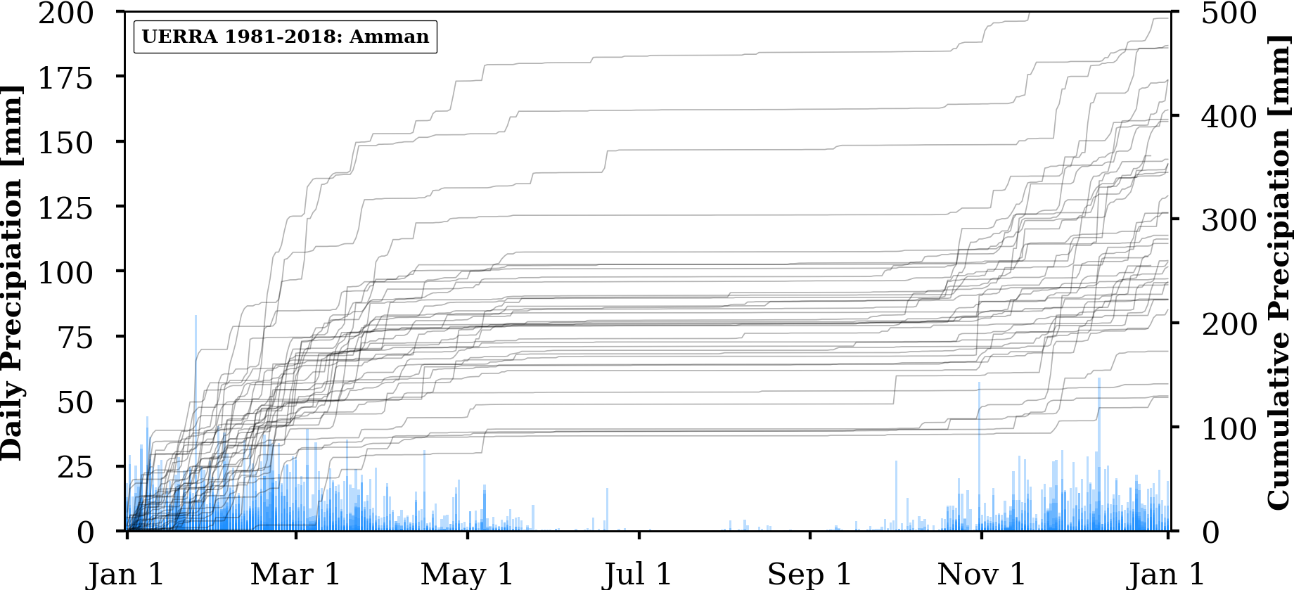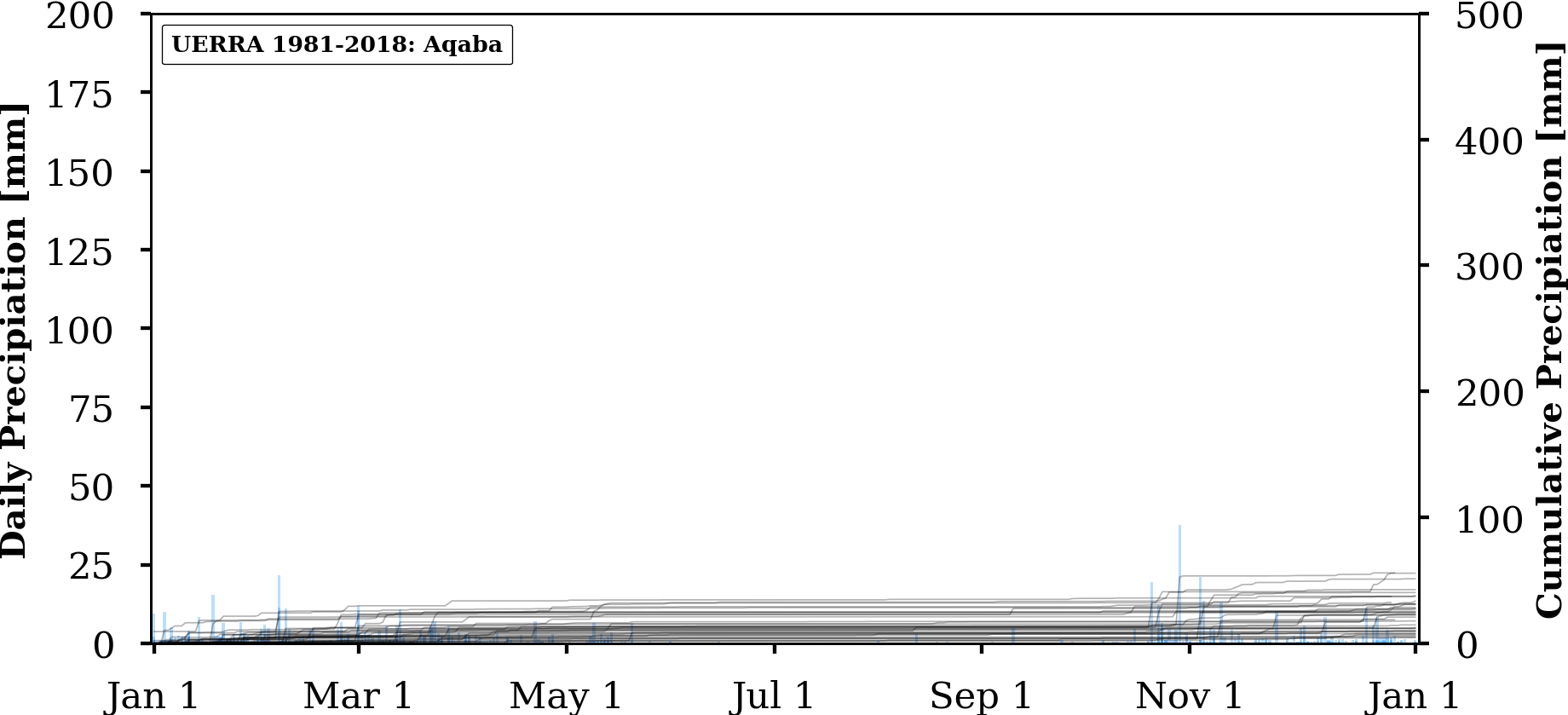 FIGURE: Charts of absolute (bars) and annually cumulated (lines) values of daily precipitation for three selected locations in Jordan (Amman, WadiMusa, Aqaba) extracted from three different gridded data products: UERRA, ERA5 and CHIRPS.