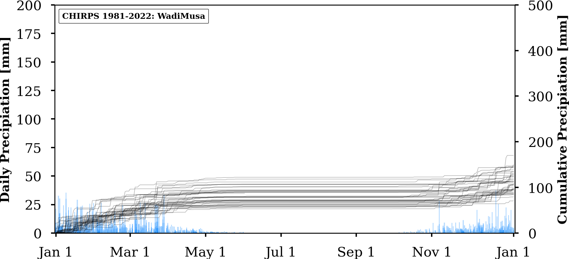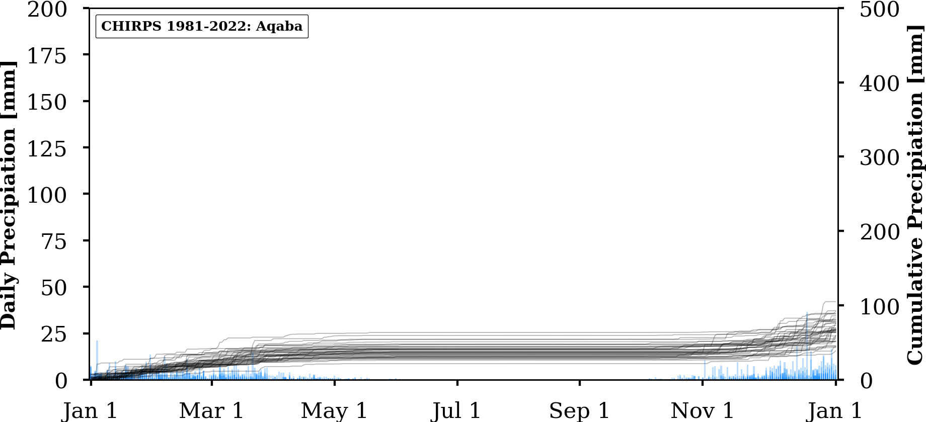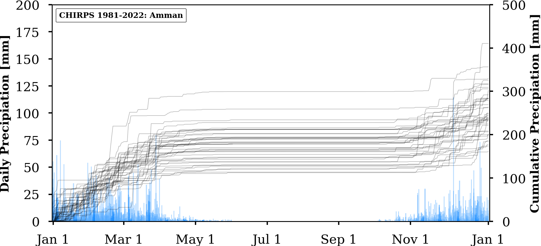 FIGURE: Charts of absolute (bars) and annually cumulated (lines) values of daily precipitation for three selected locations in Jordan (Amman, WadiMusa, Aqaba) extracted from three different gridded data products: UERRA, ERA5 and CHIRPS.