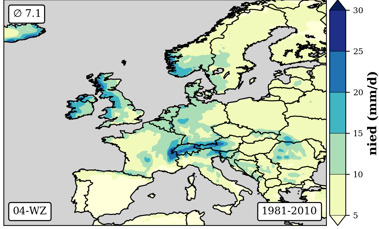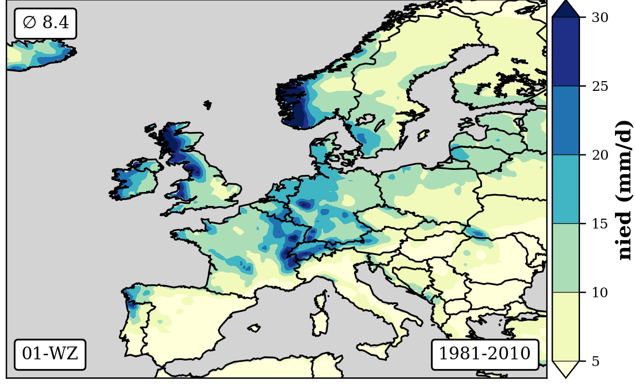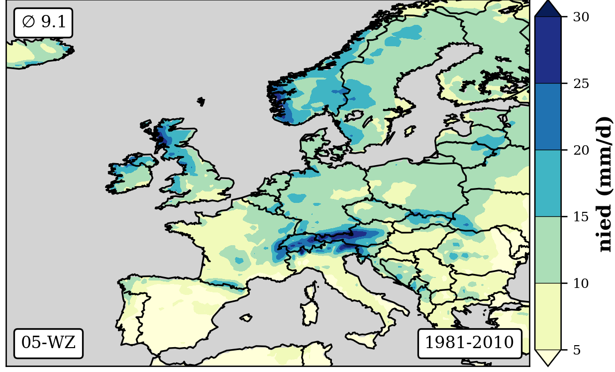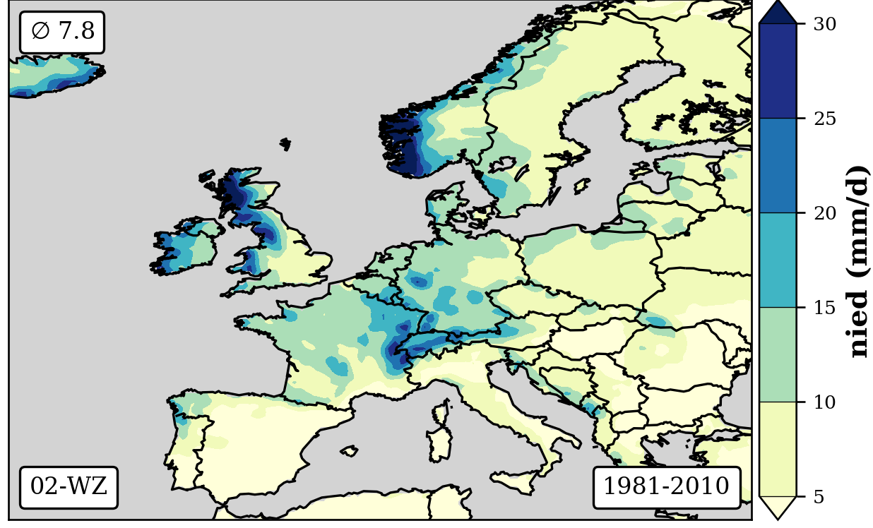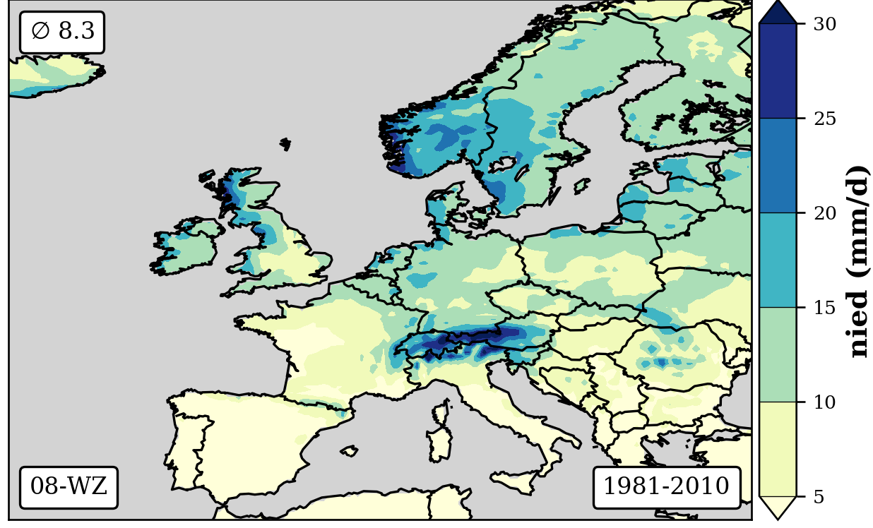 1981-2010 long-term averaged daily precipitation patterns per month and weather-type