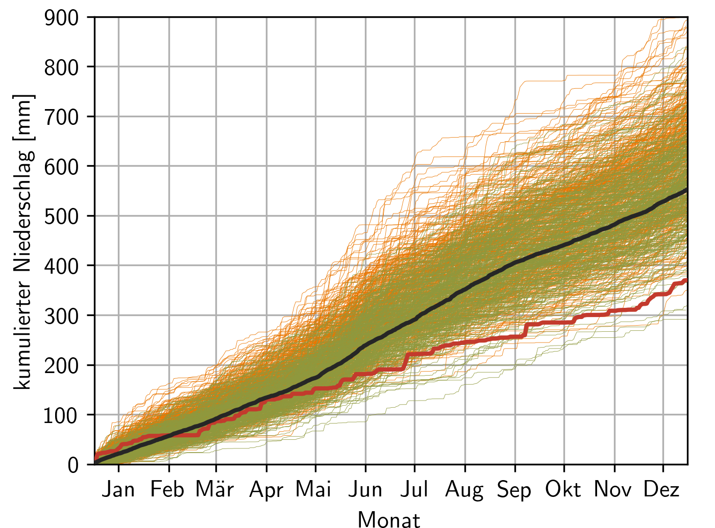 Trockenjahre wie 2018 (rot) bleiben in Klimasimulationen weiterhin die Ausnahme