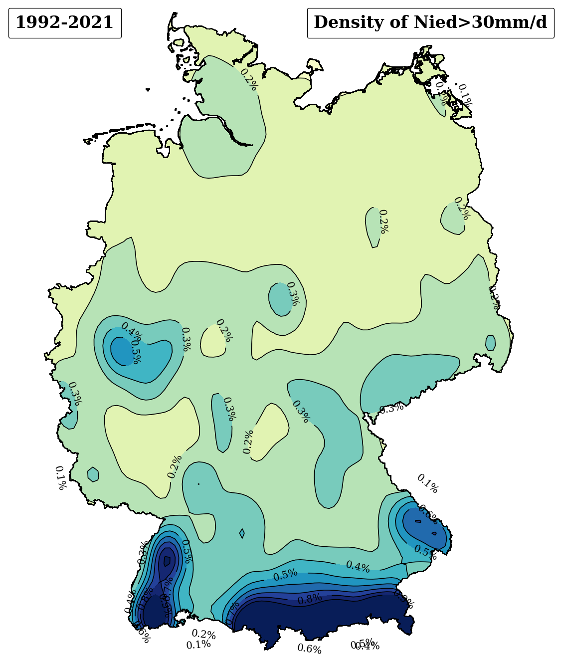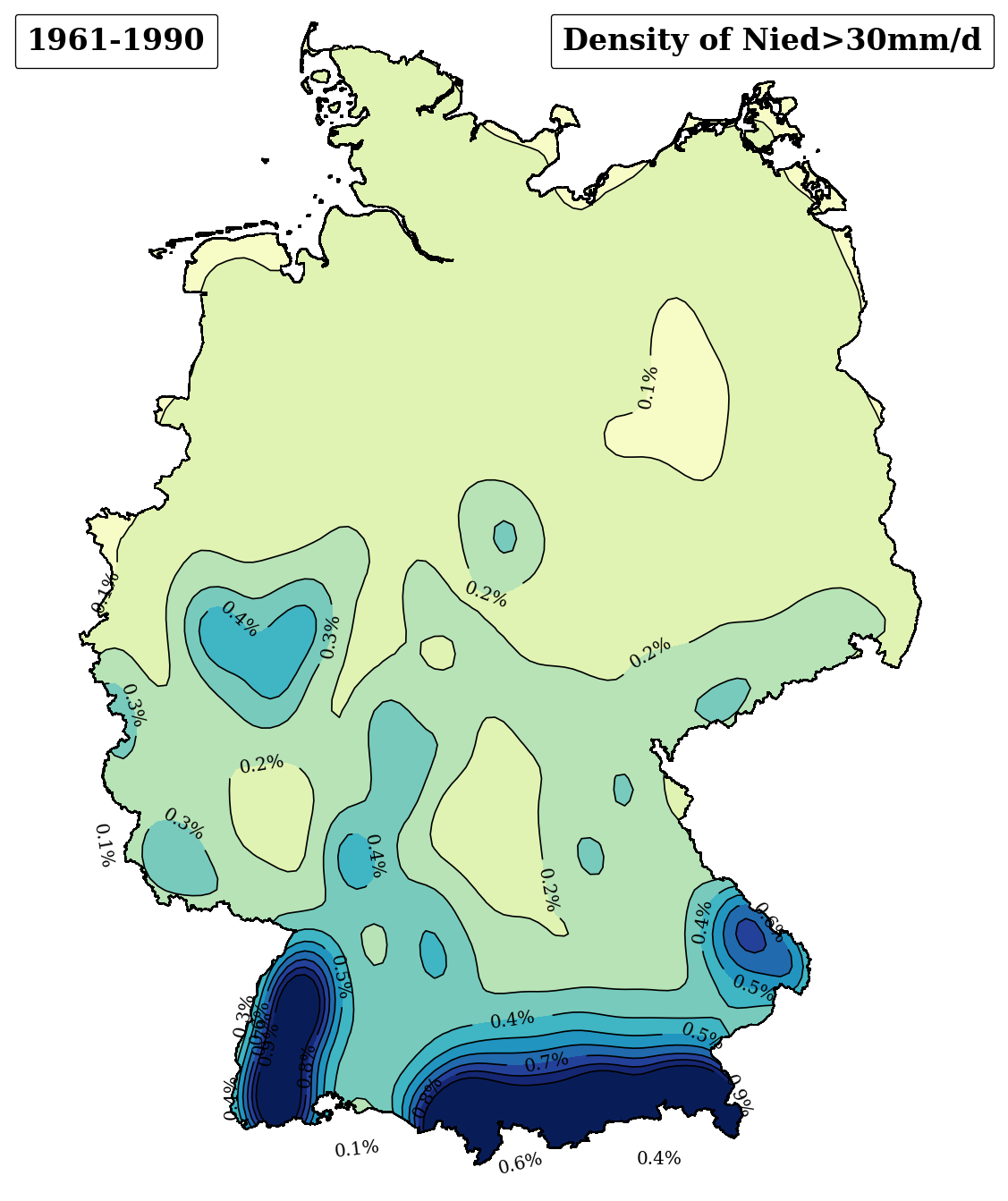 Wahrscheinlichkeitsdichte für Tage über 30 mm