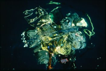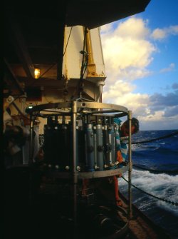 The CTD (conductivity, temperature, depth) probe disappearing below the water surface |